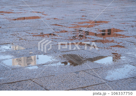 横浜の赤レンガ倉庫が反射してる道の水溜まり。