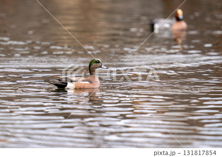公園の池で泳ぐアメリカヒドリとヒドリガモ