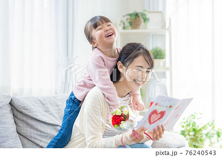 ファミリー 母の日に花束と手作りカードを渡す女の子とママ
