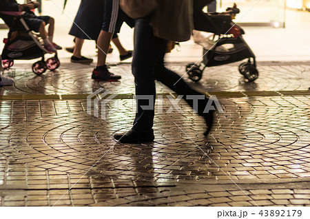 Their hurried pace and absorbed expressions highlight the modern rhythm of city life.