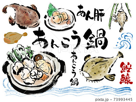あんこう鍋などの料理やあんこうのイラストと手書き文字セット