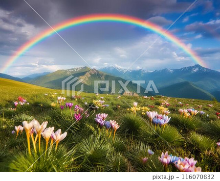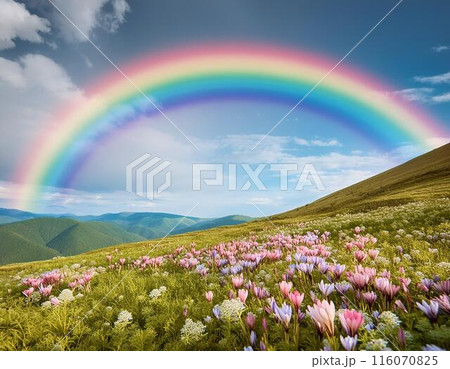 虹がかかる高原に咲く花