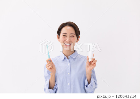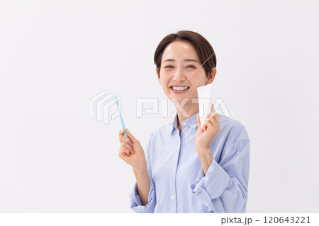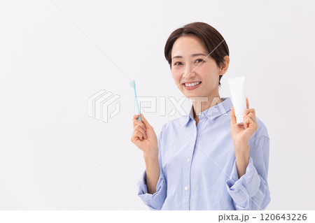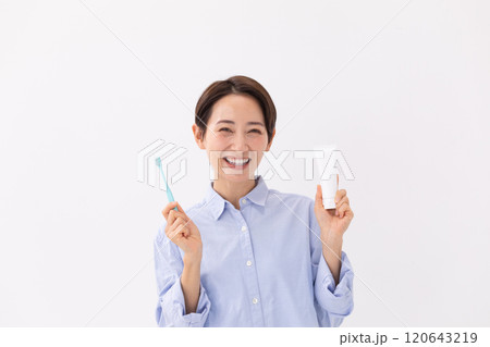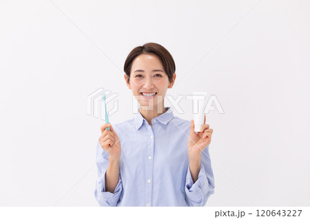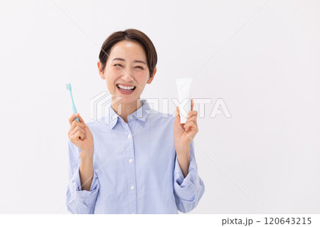笑顔で歯ブラシと歯磨き粉を持つ女性のイメージ (写真素材)