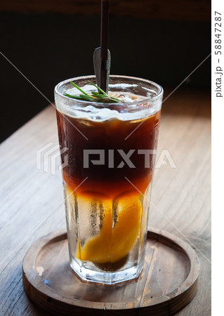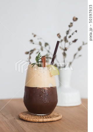 Hand holding a glass of cold espresso coffee with red orchid flower Background blurry views.