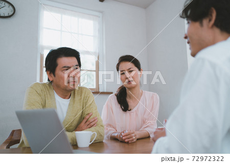 ハウスメーカー・住宅業者でクレーム・苦情を言う女性顧客と頭を下げる作業着姿の男性ビジネスマン