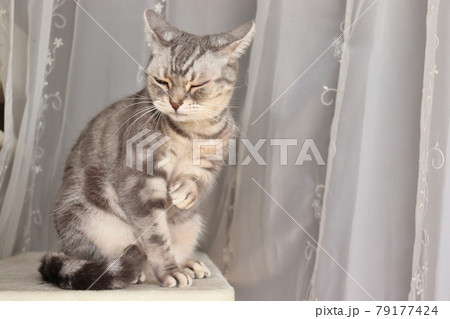 イカ耳で手を引っ込める猫アメリカンショートヘアブルータビー