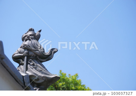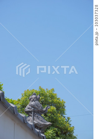 ≪神仏≫ 空と木を背景にした民家の塀にある鐘馗瓦