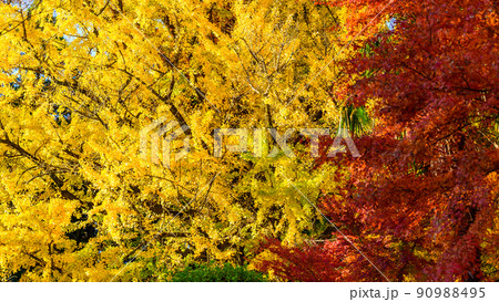 阿蘇山西巌殿寺「秋晴れ空を背景に大イチョウとモミジ紅葉景色」(観光地)阿蘇市黒川