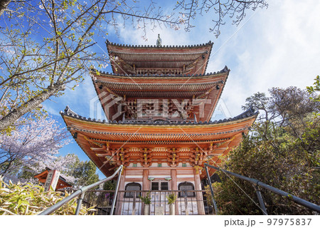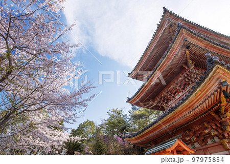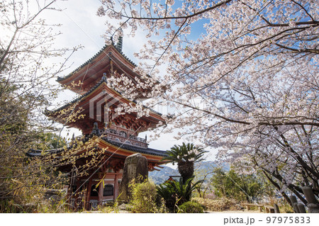 潮音山向上寺 生口島 三重塔と桜 広島尾道観光スポット 瀬戸内海国立公園