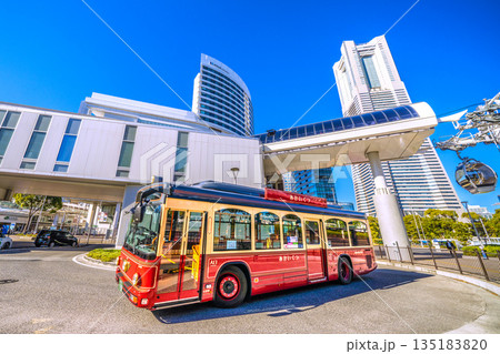 日本の横浜都市景観 横浜市営バス・桜木町駅前市役所口やあかいくつ、横浜市役所などを望む