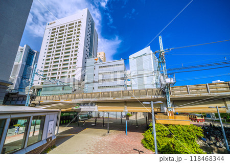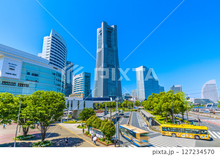 日本の横浜都市景観 横浜駅前(東口)を走る国産初の連節バス・ベイサイドブルーなどを望む
