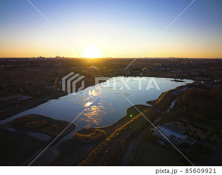 雄大で美しい伊佐沼の夕日と川越市の眺め 埼玉県川越市(ドローンによる空撮)