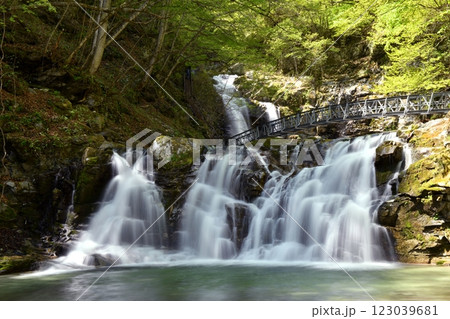 新緑のゴールデンウィーク、山梨県北杜市、日本滝百選北精進ヶ滝を観瀑台から見る