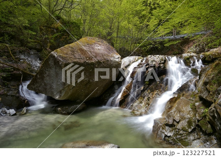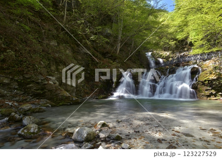 新緑のゴールデンウィーク、山梨県北斗市石空川渓谷の二の滝