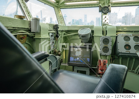 A view from the ship's captain's chair showcasing navigation gauges, an analog radar screen, and old communication panels. The monitor displays footage of the ship deck while the New York skyline is