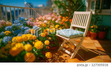 White folding chair with striped cushion stands on sunny balcony near vibrant flower pots with blue hydrangeas and yellow marigolds calm mood cozy atmosphere summer retreat concept
