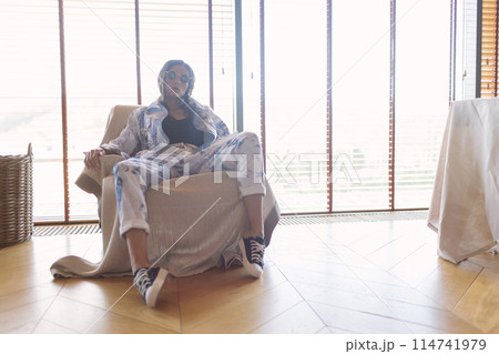 Soft white blanket elegantly laid over a cozy white armchair illuminated by gentle sunlight in a serene indoor setting