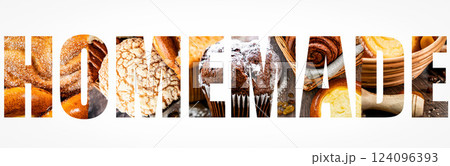 Photo collage with fresh sweet buns, in the shape of the word homemade. pastries, background for bakery or banner for baker's website with space for text