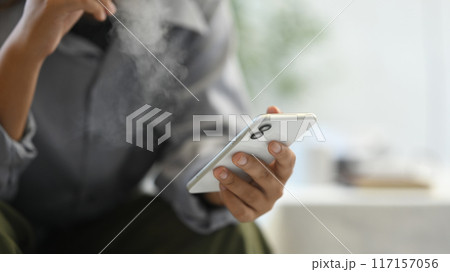 Cropped image of man smoking disposable electronic cigarette and using mobile phone