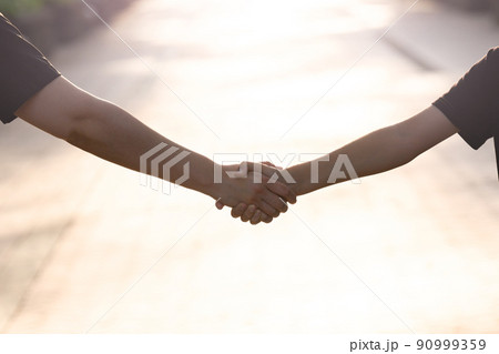 夕日の中握手する手元