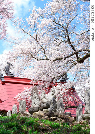 桜が咲く山門と石像 信州の桜 いにしえの石像 美しき桜の花 花と植物が織りなす色紙