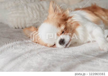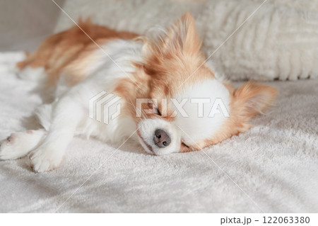 白い毛布の上で眠るチワワの子犬