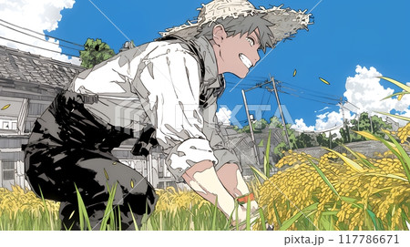 稲刈りをしている男性