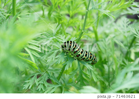 家庭菜園のニンジンの葉についたキアゲハの幼虫、昆虫イメージ素材