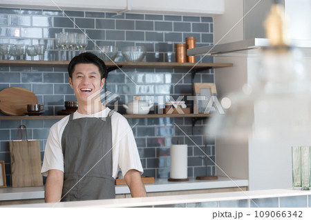 キッチンに笑顔で立つ男性 店舗の売上アップなどのイメージ