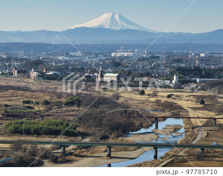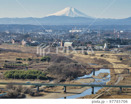 富士山と入間川と街並み 埼玉県川越市(ドローンによる空撮)