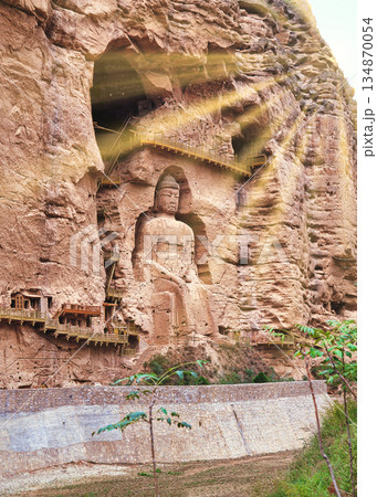 炳霊寺石窟の摩崖仏に差し込む太陽光線合成
