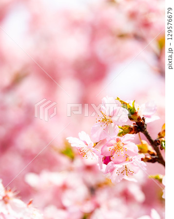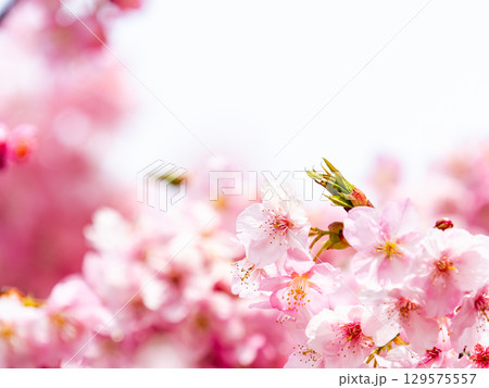 早春の満開の華やかな河津桜と蜜を集めるミツバチ