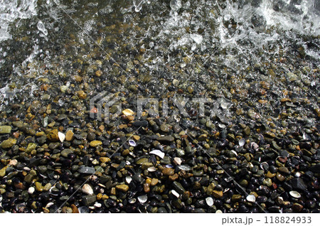 広大な砂浜が広がっている太平洋。波がどこからか石を運んでくる。波に洗われ陽の光を浴びて輝いていた。