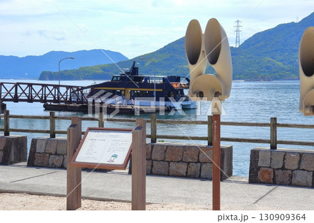 大久野島のウサギの耳型集音器と桟橋に停泊中の観光船(広島県竹原市)