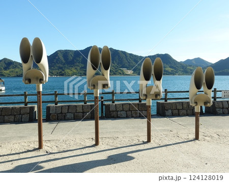 大久野島のうさぎの耳のオブジェ(集音器)と大三島