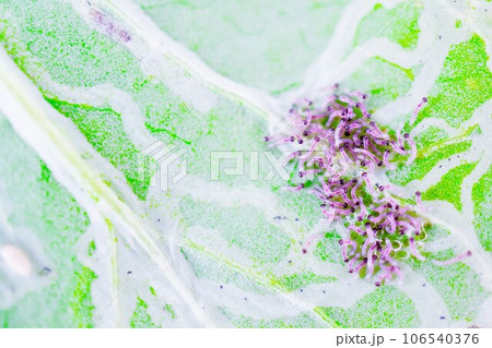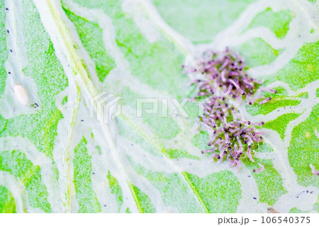 ハモグリバエの被害に遭った小松菜の葉を集団で食害する孵化したばかりのヨトウムシの幼虫の群れ