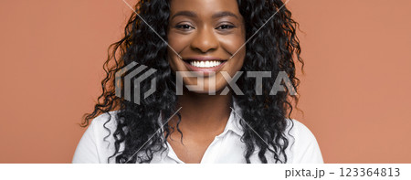 This image features a young black woman with long, curly black hair. She is wearing a white shirt and smiling at the camera. The background is a light orange color.