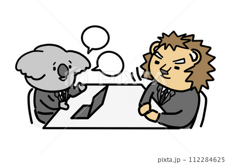笑顔で説明する部下と話を聞く上司 動物のキャラクター