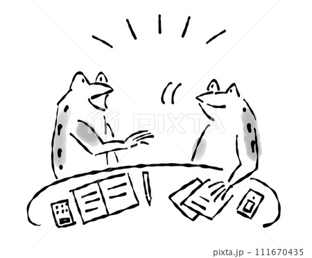 日本画(水墨画)タッチのカエルの擬人化したイラスト- 会議をする