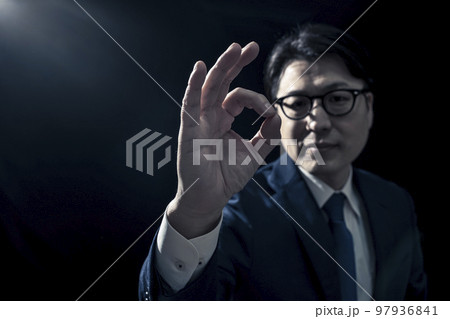 親指と人さし指で輪っかを作りOKのジェスチャーをするビジネスパーソン