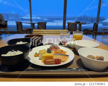 ホテルの朝食バイキング 雪が見える席