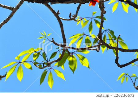 うりずんの晴天とモモタマナの若葉とリュウキュウヒヨドリ