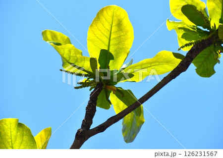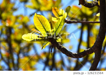 うりずんの晴天に透けるモモタマナの若葉のグラデーションカラー