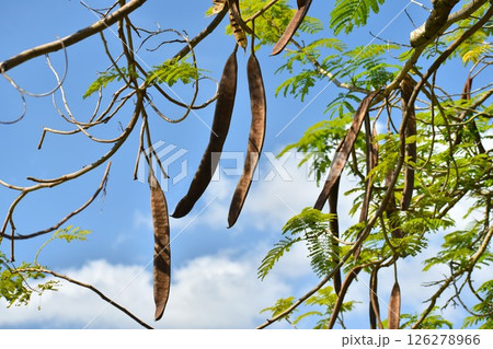 うりずんの晴天とホウオウボクの茶色のサヤ