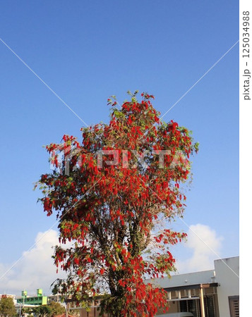 うりずんの晴天と赤瓦屋根と満開のデイゴ