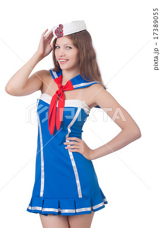 Young woman fashion lookbook model studio portrait on blue background with copyspace