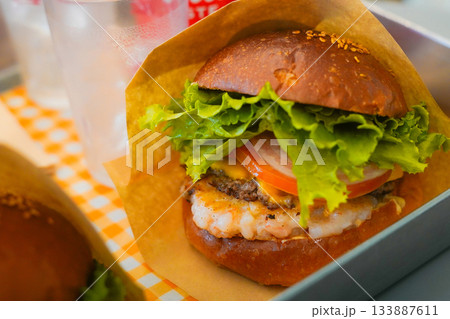 Delicious Handmade Shrimp Burger with Crispy Shrimp Patty and Fresh Vegetables