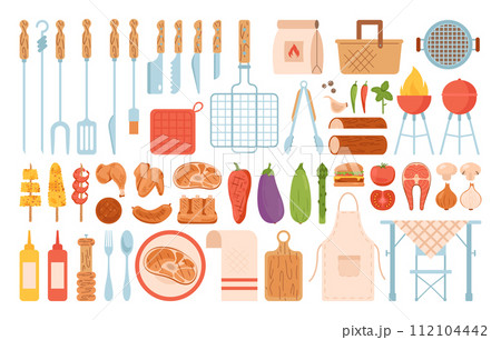 Barbecue set. Grilled food and equipment for outdoor cooking. Steak, chicken, sausages, vegetables. Grill, coal, skewer, scapula. Seasonings for grilled food. Picnic items Flat vector illustration