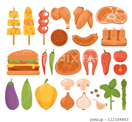 Barbecue set. Grilled food for BBQ party or summer picnic. Steak, chicken, sausages, vegetables, roasted meat, salmon steak and shrimps on a skewer and seasonings. Flat vector illustration