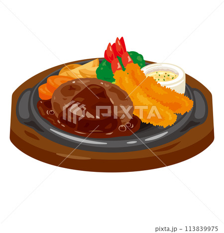鉄板に盛られたハンバーグとエビフライ